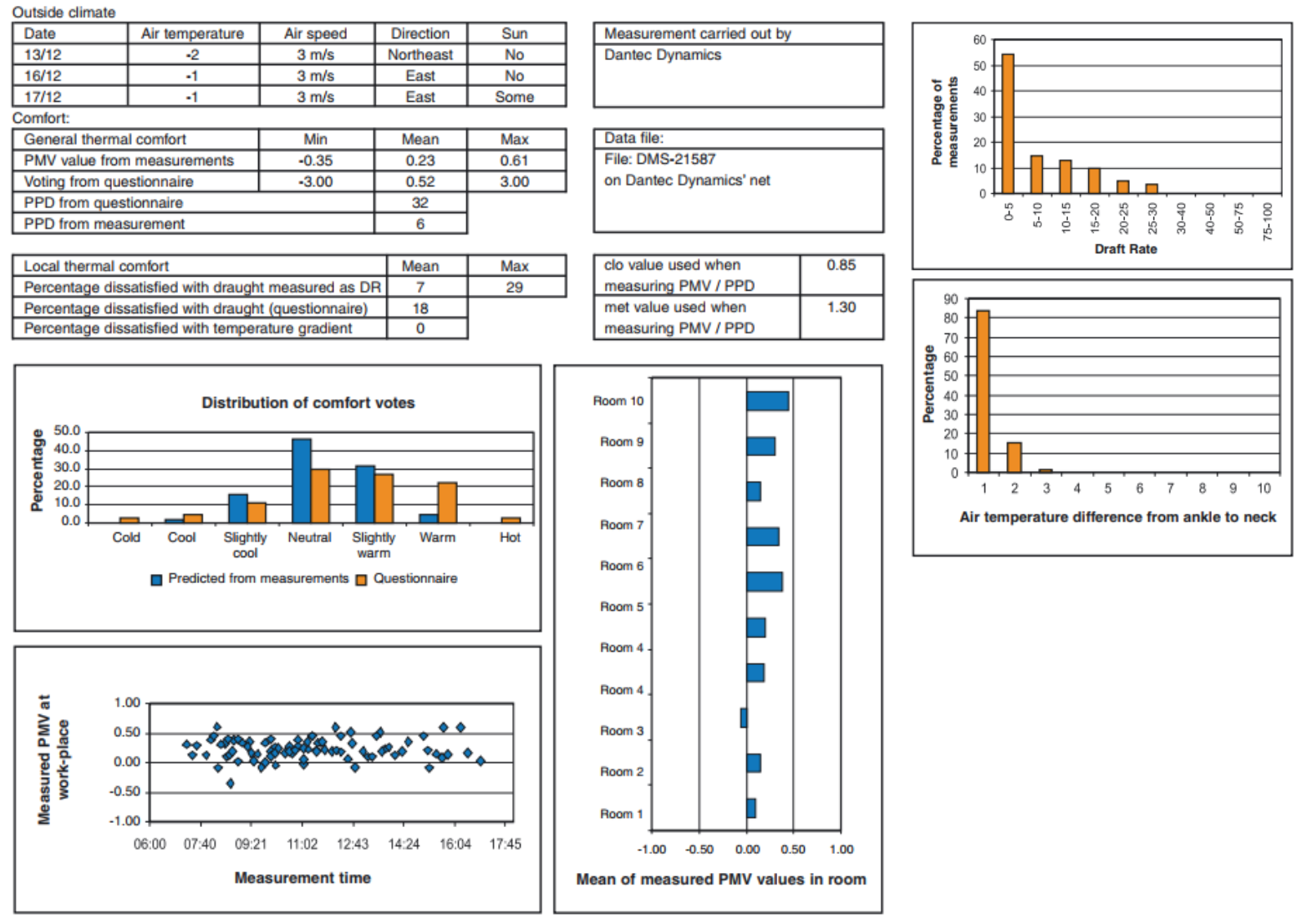 根据下图给出处理后的测量结果,通常可以得出以下结论:所测建筑物的室内舒适度良好。预估不满意人数(PPD)为6%,在可接受范围。通风问题并不普遍,但在某些工位依然存在,测量结果也证实了这个问题。详细结果如下: