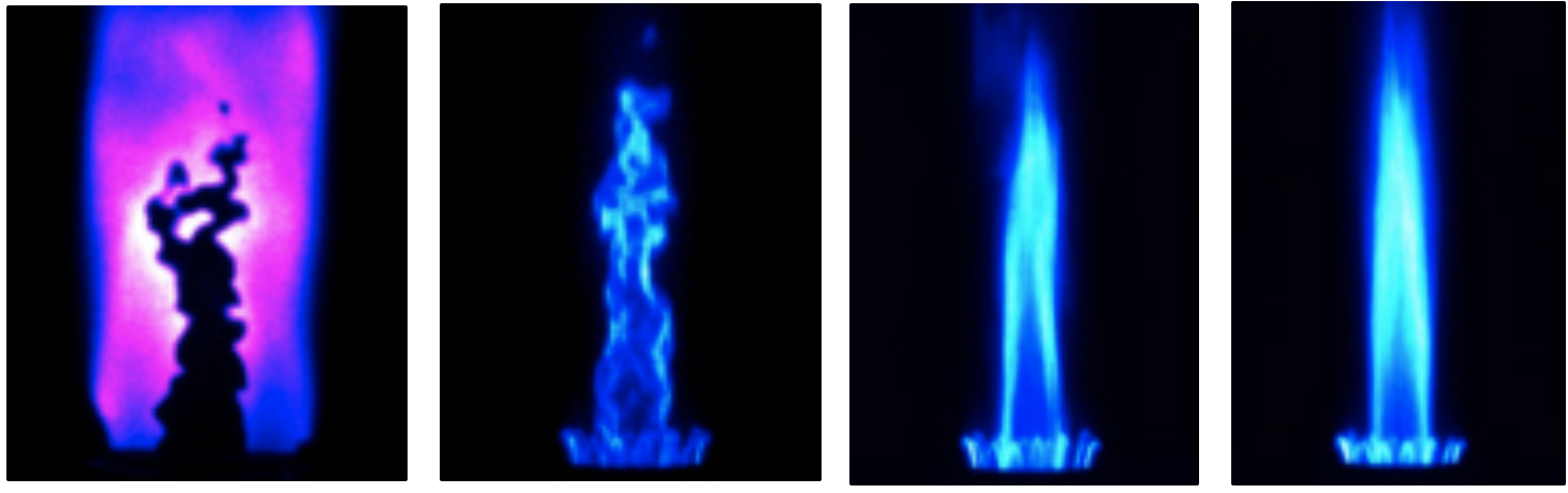 LIF图像显示火焰薄片的快照,而化学发光法图像显示整个火焰的视线信息。此外,化学发光技术需要更长的曝光时间以收集足够的光; 因此,湍流结构在图像采集期间改变。在化学发光法图像的序列中非常清楚地捕获了这种变化,其中每个图像的曝光时间增加。即使对于最短曝光时间为100μs的图像,由于曝光期间的移动,结构也会略微模糊。