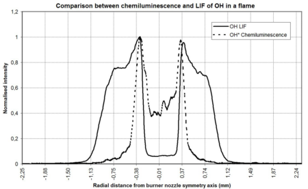 当比较通过火焰的水平横截面时,很明显两种技术都设法将火焰前锋检测为燃烧器气流两侧的OH峰值。然而,通过LIF测量得到的OH值,在主峰外部也显示出较低的OH稳定水平。这表示火焰后气体中存在OH。 OH在该区域中未被化学激发,因此在化学发光法测量中未见。值得注意的是,化学发光法在火焰中心不会降低到和LIF的测量值一样低的强度。这是因为化学发光法成像是一种视线技术,因此从相机镜头的焦平面的前方和后方收集光。