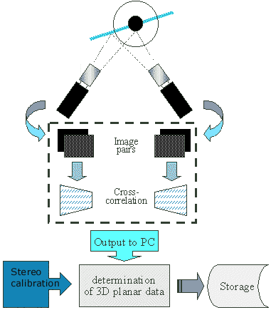为了在空间上解决流体中的梯度对计算的影响,使用自适应相关技术在3D速度重构之前处理图像。该自适应相关技术依赖于执行多次互相关计算的多次迭代算法,由此在每次计算中使用来自前一次计算的结果来提高下一次计算的准确性。第一次迭代是传统的互相关计算,但是在第二遍中,第二帧上的查问域(IA)相对于第一帧上的相应IA偏移。来自第一次迭代的结果用于确定在第二帧上IA应该移动多少。与传统的互相关方法相比,它提供了更好的空间分辨率和动态范围。用于本测量的程序概述如下:
