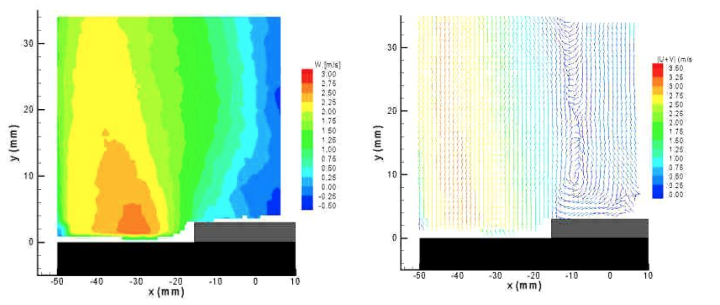 以下是在燃烧器底部和无火焰条件下的一些结果(图5和图6)。得到的速度图覆盖了57.3mm宽,40mm高的区域,包含大约9000个矢量。喷雾位置为x=0 mm。