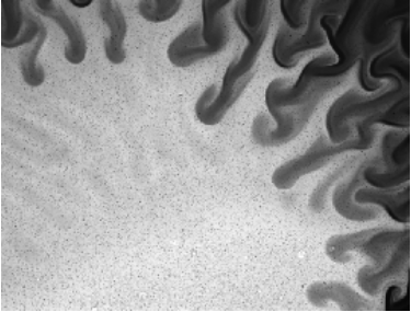 系统处于透射照明模式,粒子图像记录为阴影。在混合实验中,两相的图像对比度之间通常存在差异。亮相下方是水,较暗相是磁性流体,均为1μm颗粒。使用20x物镜和0.5x C-mount适配器(1550像素/ mm),视场(FOV)为867μmx660μm。