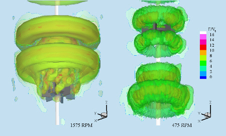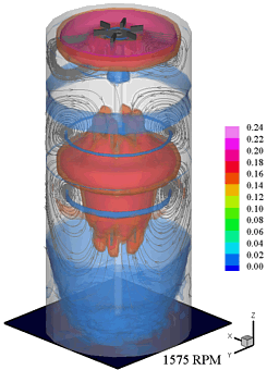 循环强度等值面突出了下部两个叶轮周围的环形涡流结构-随着搅拌速率的增加,下部涡流结构被向上推动并部分地与中间叶轮周围的涡流结构合并。