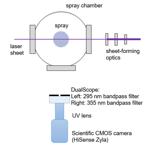 在这项研究中,研究了一个由向外开口的压电驱动喷射器产生的空心锥形喷雾器,喷油器器安装在一个带有石英窗的定容弹室中,提供可控的稳定测试环境。正己烷用作汽油的替代燃料,与形成荧光示踪剂的激发复合体 - 氟苯和二乙基甲胺一起使用。使用以10Hz运行的Nd:YAG激光器(266nm)的四倍频的平行激光片进行荧光激发。来自液相的复合荧光图像和来自气相的单体荧光喷雾图像可以通过配备双镜头的单个UV敏感sCMOS相机(HiSense Zyla)获得,所述双像镜具有选择性地在295nm处发射单体荧光并且在355nm处发射激发复合体荧光的滤光器。由于荧光被氧强烈猝灭,因此大多数实验在氮气环境中进行。