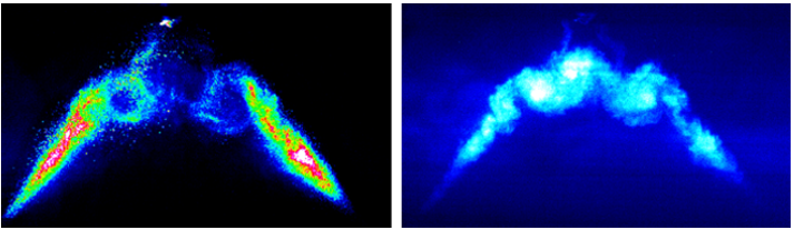 在喷射期间和喷射结束后的不同时间步记录图像,观察到这种类型喷射器的典型喷雾形成,即燃料形成膨胀锥,片破裂形成的涡旋结构和涡流在喷射结束后继续扩大。首先在与液滴相同的位置观察燃料蒸汽,然后将其积聚到涡流的中心。此外,发现液相和气相的渗透非常相似。已经测试了各种喷射压力,这表明将燃料压力从10MPa增加到20MPa导致更大的涡流结构。燃料蒸发之后可以研究单体和激发复合体荧光随时间的演变。在室温下,发现蒸发非常缓慢,但是在40℃以上,在喷射结束时有明显的蒸汽存在,并且在更高的温度下,蒸发变得更快。