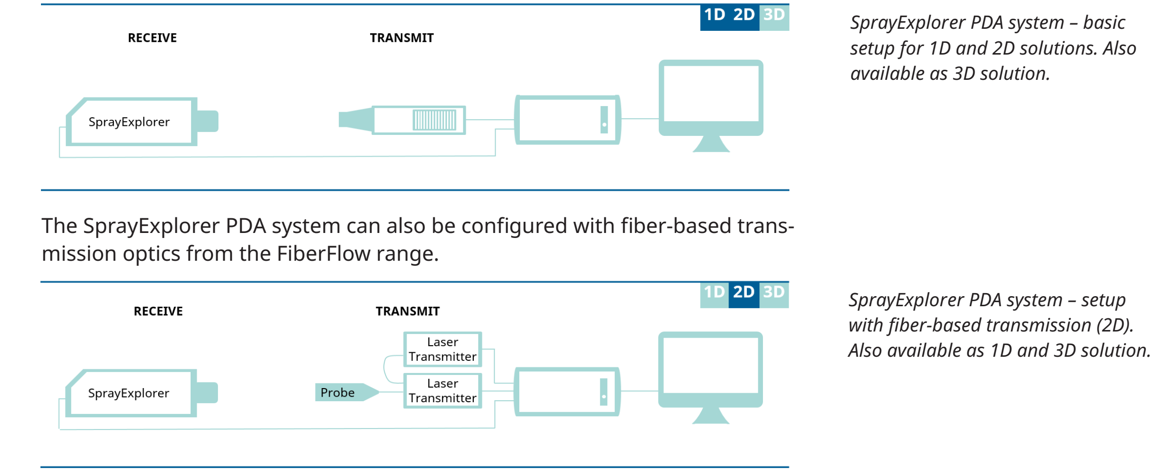 SprayExplorer包括大孔径前置透镜、软件控制MASK的选择和内置光电探测器。内置摄像头和用于PDA接收探头与测量体可视化的LED光源,使PDA接收探头与测量体光学校准更加简易。SprayExplorer PDA接收探头确保了高测量精度,适用于高浓度喷雾以及其他高粒子浓度的测量试验。