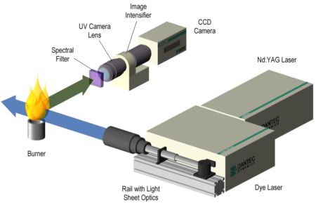 OH的LIF(激光诱导荧光)成像是用于反应流动中火焰前沿研究的广泛使用的技术。该技术涵盖了从实验室燃烧器到卡车大小的内燃机和燃气轮机燃烧器的应用领域。通过Nd:YAG泵浦染料激光器激发火焰中的OH产生荧光。