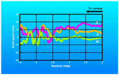 沿着飞行路径的典型速度曲线如图1所示。飞行方向从右到左。 x轴是距离机场的海里距离。起初(曲线的右端)风况非常规律,几乎恒定的正面水平风。然而,当热线进入峡湾时,U分量反转并产生剧烈的湍流,在垂直W分量的方向上也存在剧烈的波动(等比例放大后几乎相当于±10m / s)。这些情况持续到距离跑道约1.5海里的坠机地点。随后飞行模拟器的后续测试证实,在这些风力条件下,飞机几乎没有机会安全着陆。