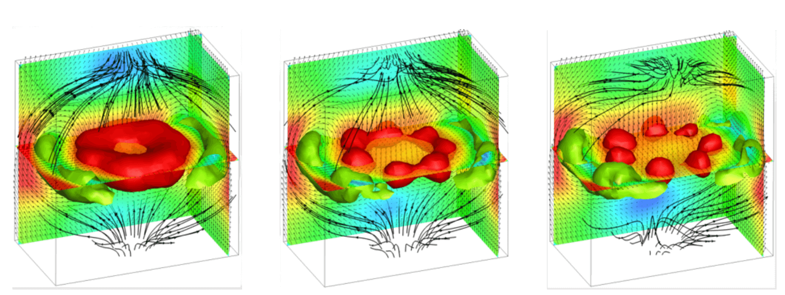 涡环的时间演化,从左边的层流开始,直到右边的湍流破裂前不久。切片中的颜色表示绝对速度,绿色的等表面表示涡核,以及随着时间的推移涡核是如何变形的。红色等表面显示出向上的速度分量,表明在演化过程中形成的不同口袋驱动了二次涡的演化。参见Brucker等人(2013)"view volumetric PIV via high-resolution scanning, isotropic voxel restructuring and 3D least-squares matching (3D-LSM)"